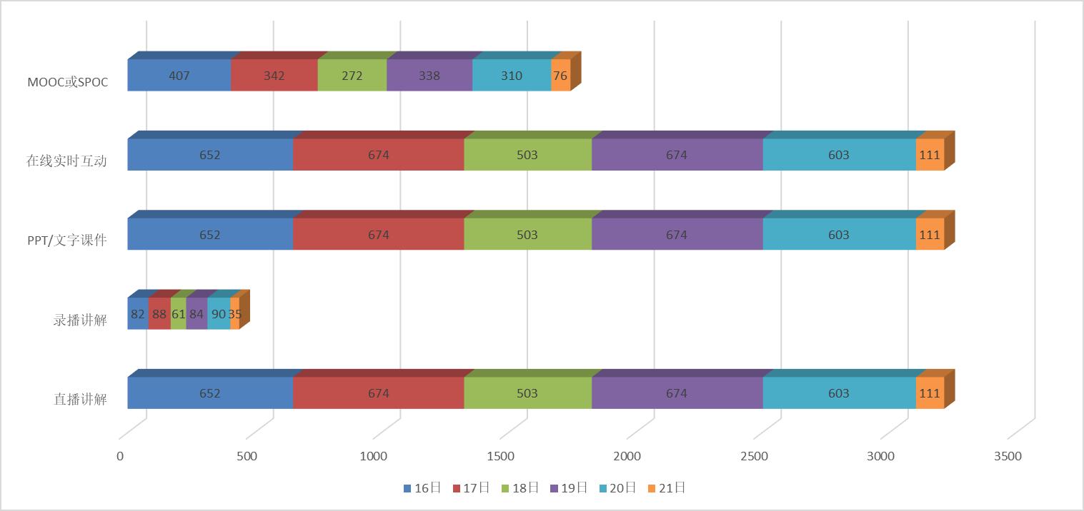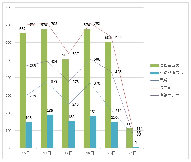 教学检查为期一周(3月16日—3月22日),校、院两级教学督导和相关教学管理人员共计160人,进入课程群和直播课堂听课582门次,全面掌握线上教学动态,实时了解师生的教学意愿和需求,及时改进完善课程准备、教学设计、网络资源、效果反馈等教学环节。