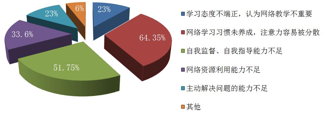 影响在线学习效果的自身因素:64.35%的学生归因于网络学习习惯没有养成,注意力容易被分散;51.71%的学生归因于学习过程中自我监督、自我指导能力不足;33.6%的学生归因于网络资源利用能力不足,除了听老师讲课内容外不知道还能学什么;23%的学生归因于学习态度不端正,一定程度上认为网络教学不重要;23%的学生归因于主动解决问题的能力不足,不知道如何与老师、同学在线互动。以上问题,说明教师应该增加与学生互动交流,强化教学过程管理,给予学生更多的学习指导和心理支持,帮助学生克服学习困难和障碍。