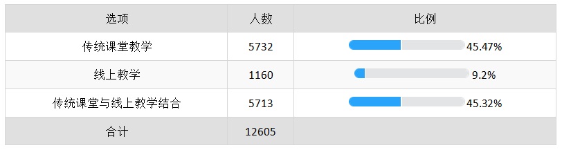 开学返校后采用课堂教学还是线上教学:近45.47%的学生建议采用传统课堂教学;近45.32%的学生建议采用课堂教学与线上教学相结合;9.2%的学生建议仍然采用线上教学,说明学生比较重视课堂教学,但对于线上教学也是比较认可,这就要求学校重视信息化教学条件,加强现有多媒体教室改造升级,实现校园wifi全覆盖,不断完善线上教学配套设施和专属课程平台建设。