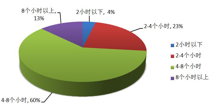 约60%的学生每天在线学习3-6门课程,在线学习时长为4-8小时,总体上看学生在线学习投入较为合理;近1/3的学生在线学习课程超过7门,约13%的学生在线学习时长8个小时以上,负担较重;约27%学生在线学习时长小于4个小时,投入偏少。