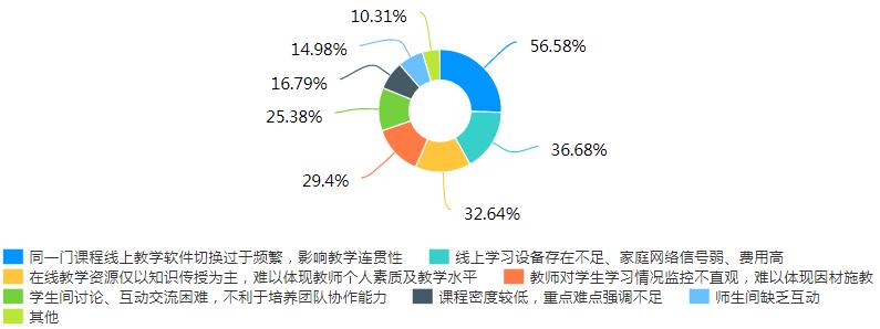 56.58%的学生反映课程平台较多,同一门课程教学软件切换频繁,影响学习连贯性;32.64%的学生反映在线教学资源仅以知识传授为主,难以体现教师个人素质及教学水平;29.4%的学生反映教师对学生学习情况监控不直观,难以因材施教;5.38%的学生反映学生间讨论、互动交流困难,不利于培养团队协作能力;16.79%的学生反映课程密度较低,重点难点强调不足,说明教师的教学设计和教学实施仍有较大提升空间,突出教学重点难点,强化团队小组互动,加强学习过程监控,确保在线教学效果和学习质量。