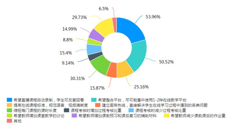 53.96%的学生建议“直播课程自动录制,学生可反复回看”;50.52%的学生希望“整合在线课程平台,尽可能集中1-2个教学平台”;30.31%的学生希望“缩短每门课程的课时长度”;30.31%的学生希望“教师减少课前课后的作业量”;25.16%的学生希望“提高在线课程标准,规范语音、视频清晰度”;15.87%的学生希望“建立服务热线,直接解决学生在线学习过程中遇到的各类问题”;15.4%的学生希望“课程考核时减少过程考核比重”;14.99%“希望教师增加课前预习和课后复习的辅助材料”。以上建议,说明教师在完善网络教学资源、尽量整合教学平台、提高课程建设标准、及时解决学习问题、合理设计教学时间,优化考核比重标准等方面应该认真思考,积极探索,细化落实。