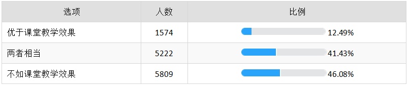 线上教学与课堂教学的学习效果:46.08%学生认为课堂教学效果好,显示学生仍习惯于课堂教学的模式;41.43%的学生认为线上教学于课堂教学效果相当,显示线上教学模式影响力逐渐增强;12.49%的学生认为线上教学效果好。后期学校将充分挖掘线上教学的优势,加大力度开展线上线下混合式教学。