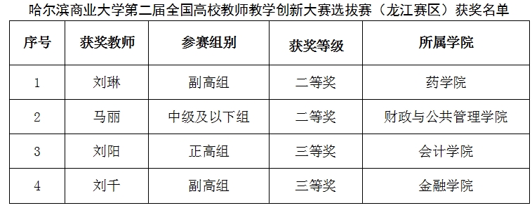 近日,省教育厅公示,在2022年5月7日、8日结束的全国高校教师教学创新大赛(龙江赛区)选拔赛中,我校4名参赛教师获得佳绩,学校荣获“优秀组织奖”。其中,药学院刘琳获得副高组二等奖;财政与公共管理学院马丽获得中级及以下组二等奖;会计学院刘阳获得正高组三等奖;金融学院刘千获得副高组三等奖。