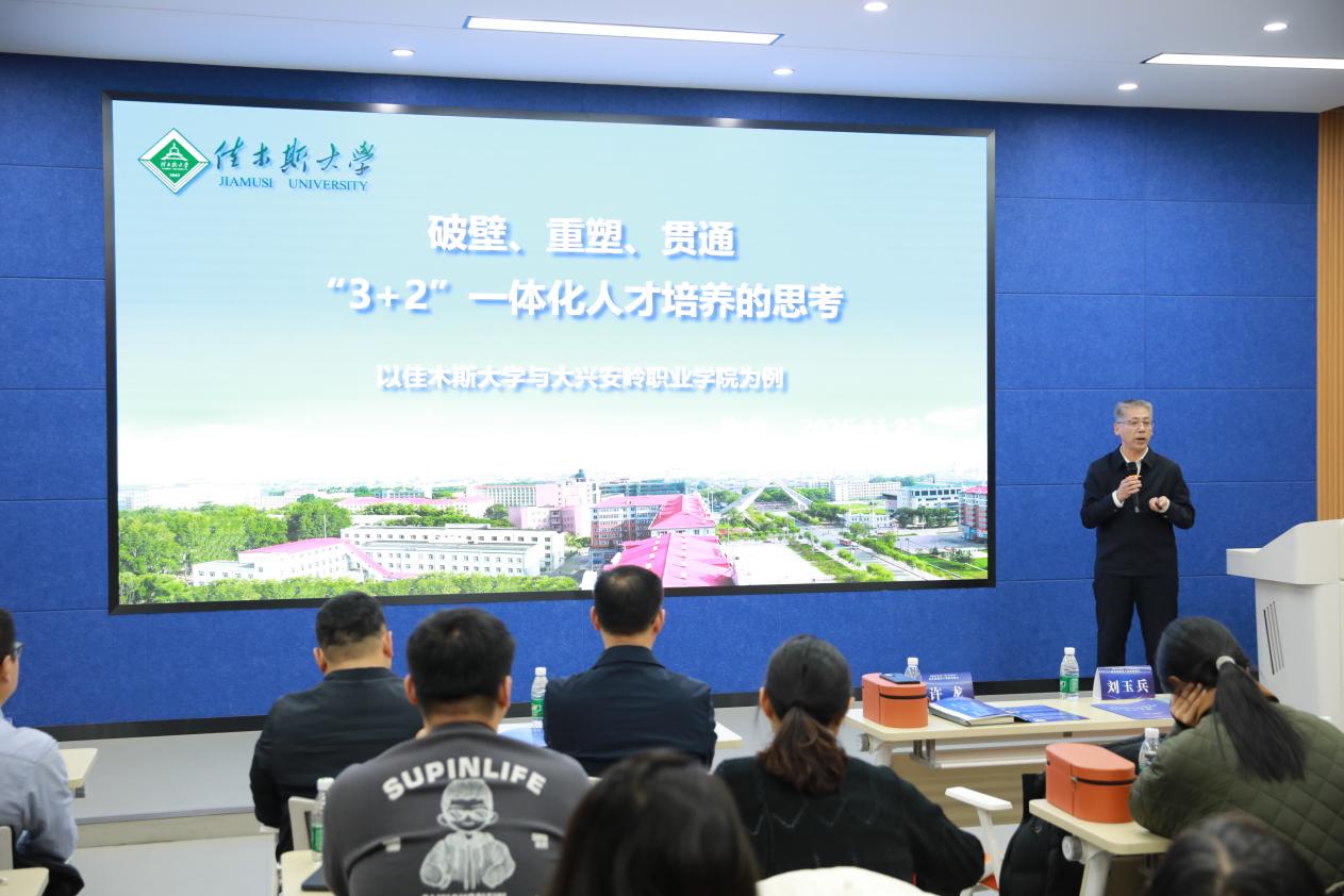 在理论分享环节,佳木斯大学生物与农业学院院长许龙以“破壁、重塑、贯通——‘3+2’一体化人才培养的思考”为题,分享了与大兴安岭职业学院合作的成功经验,强调课程衔接与资源共享在贯通培养中的核心作用。