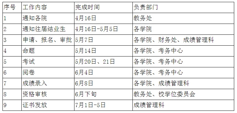 表1:往届结业生补考考试时间安排表