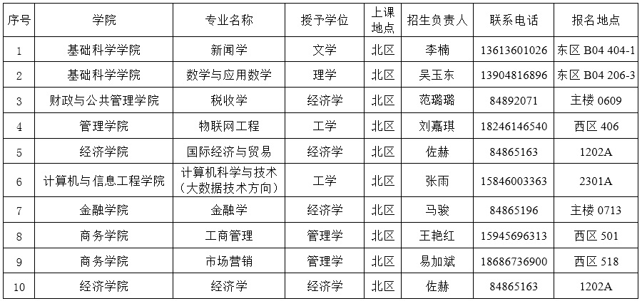 我校辅修专业学士学位教育开设税收学、物联网工程、新闻学、数学与应用数学、计算机科学与技术(大数据技术方向)、金融学、国际经济与贸易、经济学、工商管理、市场营销10个专业,招生专业见表1。