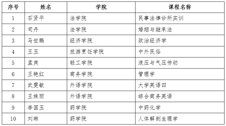 依据黑龙江省教育厅《关于开展2020年黑龙江省高等学校课程思政建设示范高校、示范课程、教学名师和教学团队等遴选工作的通知》(黑教高函〔2020〕222号)和《哈尔滨商业大学关于开展课程思政建设示范课程、教学名师和教学团队等遴选工作的通知》,由学院组织申报,经资格审查,通过组织专家评审,确定校级课程思政建设示范课程10门。