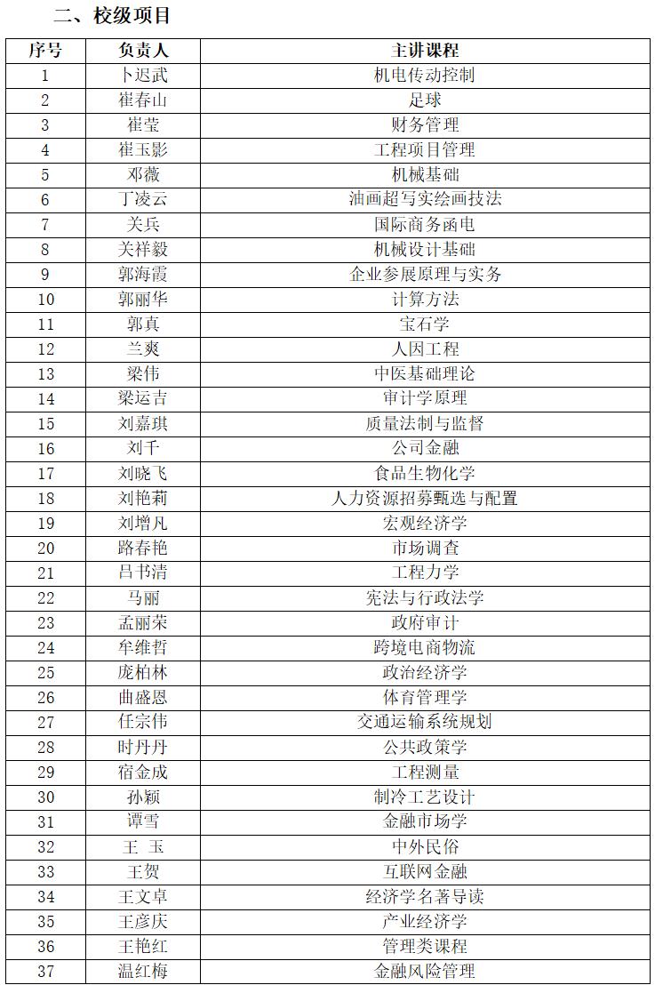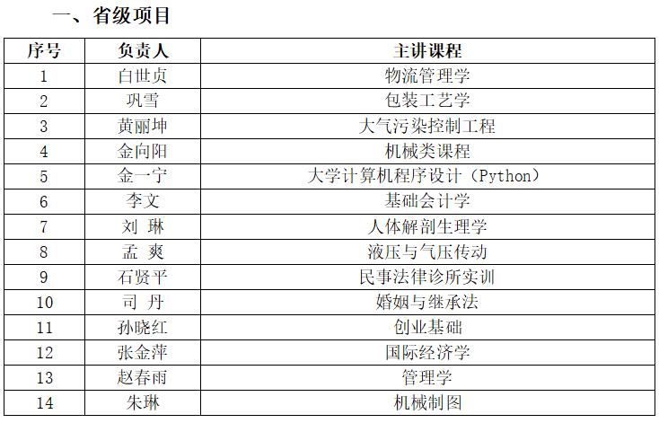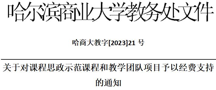 为贯彻落实教育部《高等学校课程思政建设指导纲要》黑龙江省《全面推进高等学校课程思政建设工作方案》和《中共哈尔滨商业大学委员会全面加强课程思政建设的意见》,扎实推进我校课程思政高质量建设,进一步发挥课程思政建设示范引领作用,持续完善学校课程思政教学资源库。经学校研究决定,对获批课程思政示范课程和教学团队项目予以经费支持,省级项目经费1万元,校级项目5000元。具体名单如下: